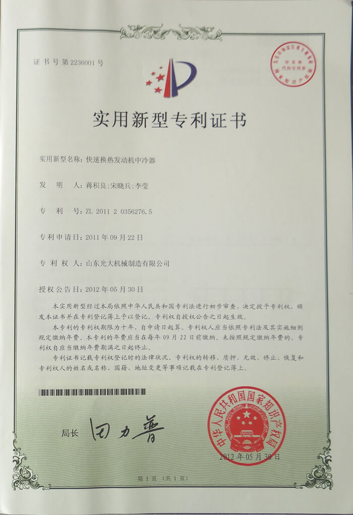 快速换热发动机中冷器-实用新型专利证书